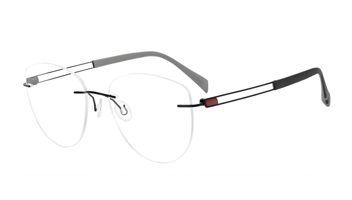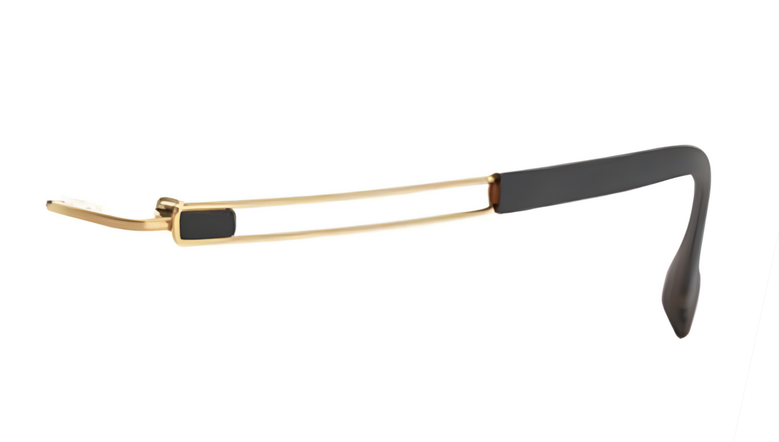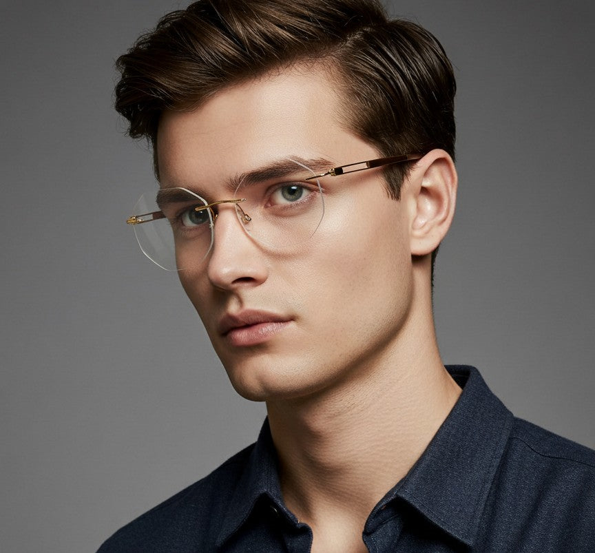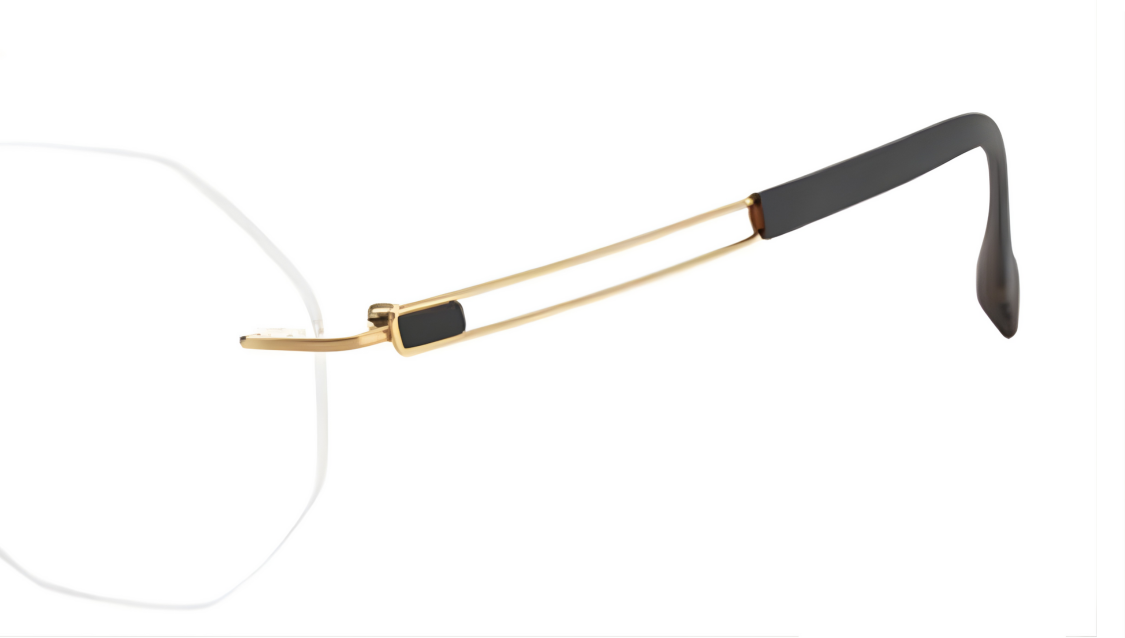 This titanium rimless frame combines a modern geometric lens shape with an elegant finish, giving it a refined and lightweight look. The double-bar temples add a unique architectural touch, while the dark, contoured temple tips provide both contrast and comfort. Its minimal, airy design makes it perfect for anyone who wants sophistication without the bulk of traditional frames.