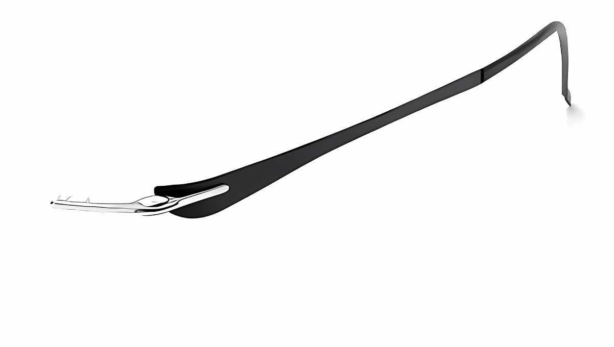 This titanium temple showcases a sleek, minimalist design that gracefully tapers from the lens connection point to the earpiece. The front connection area features an elegant, sculpted hinge design with a silver titanium insert that flows seamlessly into a matte black exterior. The temple gradually widens near the middle for a bolder, modern aesthetic, then narrows toward the tip for a lightweight and comfortable fit. The smooth curvature and precision shaping highlight the strength and flexibility of titanium, offering both durability and refined style. This combination of polished silver and matte black gives the frame a luxurious, high-end feel suitable for both professional and fashion-forward settings.